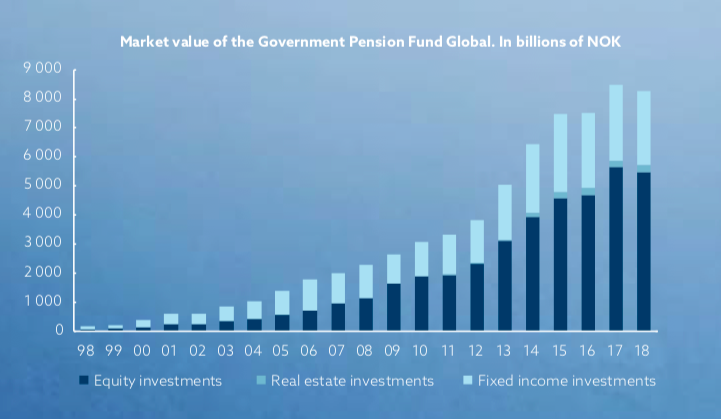 Mientras que en la mayoría de países es causa de escándalo que un fondo de pensiones estatal “juegue“ a la bolsa, el fondo soberano de Noruega dedica el 60% de su patrimonio a acciones. Otra parte es colocada en bonos (¡qué horror, invierte en deuda!) y otra en el mercado inmobiliario (¡qué horror, además es especulador inmobiliario!).