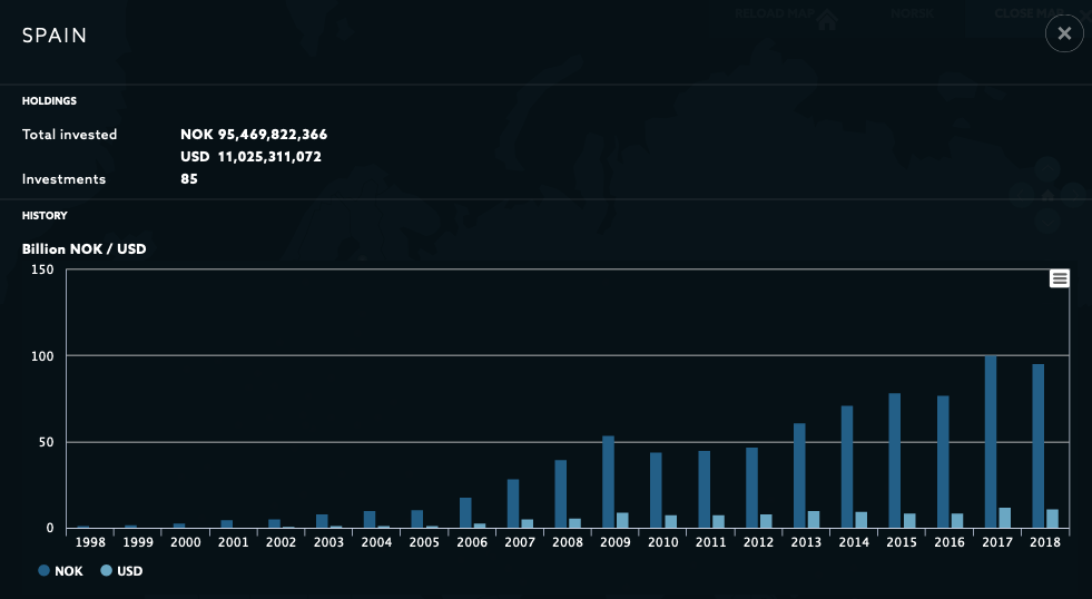 El fondo de pensiones de Noruega ha pasado de un patrimonio de 3,2 billones de coronas noruegas (320 mil millones de euros) a finales de 2011 a 8,26 billones de coronas (828 mil millones de euros) al cierre de 2018. En cambio, el fondo de reserva de las pensiones españolas ha pasado de 66.815 millones de euros a solo 8.095 millones de euros entre 2011 y 2017.