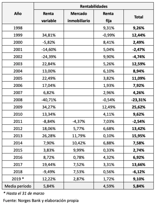 Norges Bank indica que el índice bursátil tomado como referencia ganó un 5,39% anual de enero de 1999 a marzo de 2019, de forma que el Fondo batió al mercado en 0,45 puntos anuales.