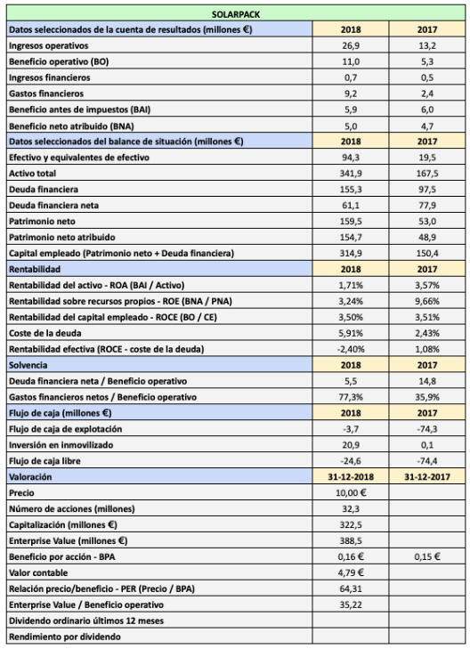 Solarpack no presenta buenos ratios financieros actualmente a nivel de rentabilidad corporativa ni de solvencia, como se observa en la tabla siguiente. En 2018 la deuda financiera neta fue de 5,5 veces el beneficio operativo y los gastos financieros netos representaron el 77% de dicho beneficio.
