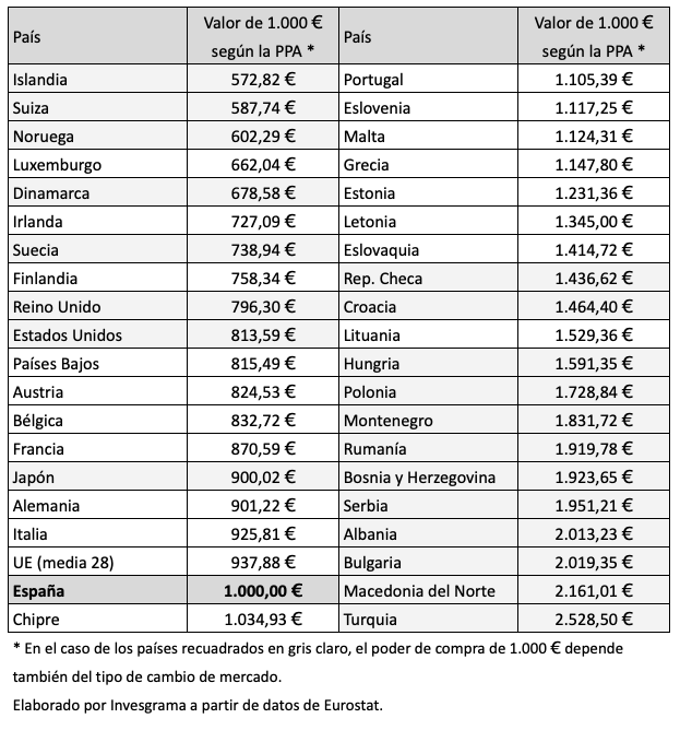 Ya se sabe que 1.000 € no tienen el mismo valor según el país en el que vivamos o vayamos a pasar un tiempo por vacaciones o trabajo. Los nacionales de Islandia, Suiza o Noruega ganan poder adquisitivo cuando viajan fuera porque en sus países el nivel de vida es más alto que la media. En cambio, si trabajan fuera de sus fronteras y obtienen ahorros, estos tienen menos valor cuando los repatrian. Los ciudadanos de Europa del Este se encuentran en la situación opuesta: viajar a Europa occidental les sale muy caro pero si trabajan en un país de alto nivel de vida y repatrian los ahorros, obtienen una notable ganancia de poder adquisitivo. ¿Pero hasta qué punto son grandes las diferencias?