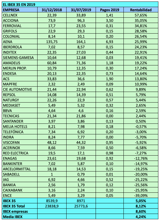 El balance anual es de una rentabilidad con dividendos del 8,12% para el IBEX 35. Sobresalen las ganancias de Cellnex, con un 57,65%, Acciona y Ferrovial con un 35%, Grifols, Colonial, Aena, Iberdrola e Inditex, con más de un 20%. Siemens-Gamesa, a pesar de la caída de julio, sigue acumulando una revalorización del 19,41% en términos anuales.