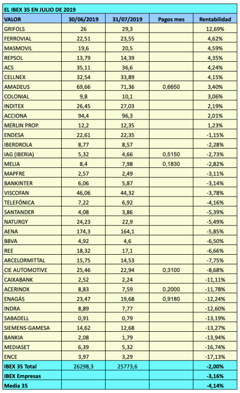 En julio el IBEX 35 perdió un 2% incluyendo dividendos aunque la media simple de las rentabilidades de los 35 valores fue negativa en un 4,14%. El selectivo cerró a 8.971 puntos, el mínimo desde febrero.