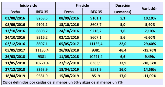 El 24 de julio el IBEX 35 todavía estaba cerca de máximos anuales, en 9.329,7 puntos (el máximo fue el 18 de abril, 9.581,9 puntos). En aquel momento, la revalorización del índice era de cerca del 10% en 2019. El 15 de agosto cerró a 8.519, por debajo de los 8.539,9 a que cerró 2018. La corrección acumulada es del 11,09% a lo largo de un período de 17 semanas. No obstante, el IBEX 35 con dividendos todavía está en positivo en 2019, con una ganancia del 2,69%.