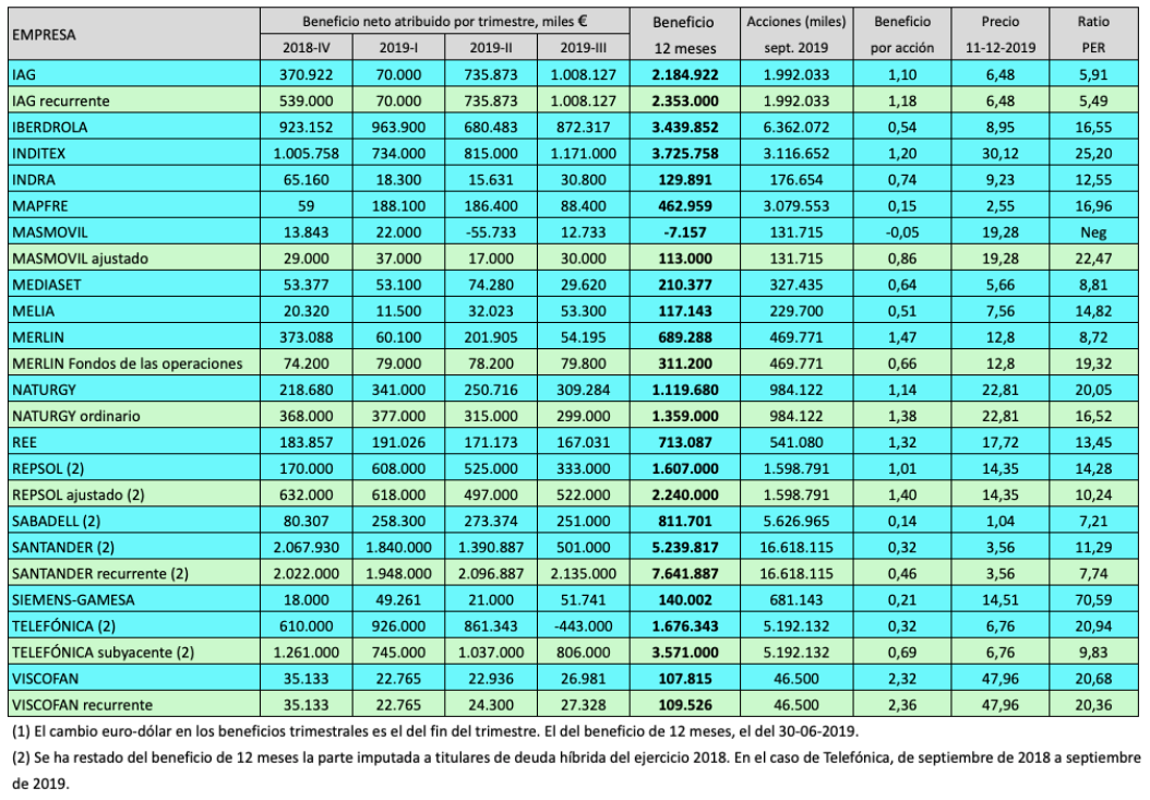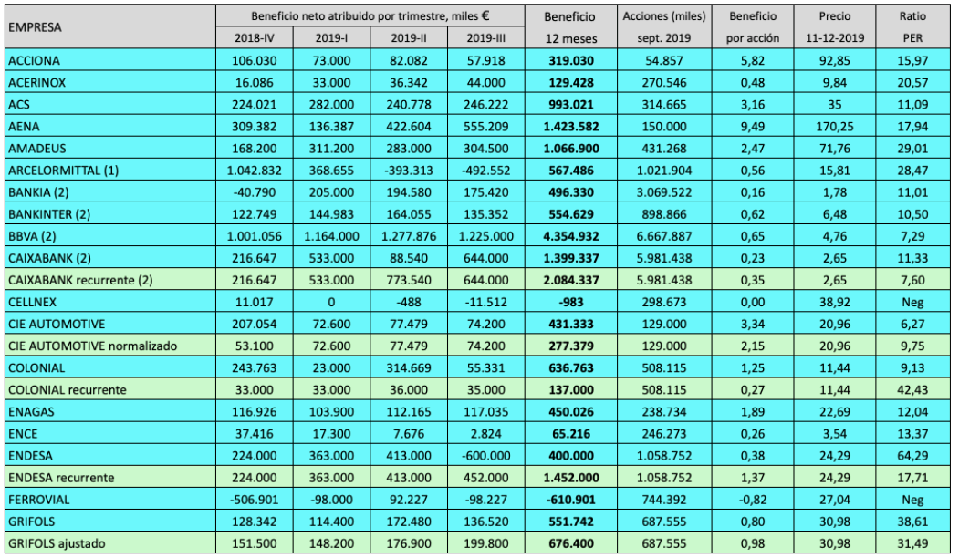 Las tablas siguientes recogen el resultado de los últimos cuatro trimestres, en miles de euros. También se indica el resultado recurrente (o un concepto similar) cuando la compañía publica este dato alternativo, así como el resultado acumulado en el período de doce meses. El número de acciones (en miles) corresponde a septiembre de 2019 y procede de la Sociedad de Bolsas.