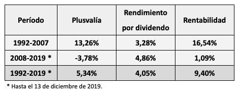Sin embargo hay dos períodos claramente diferenciados. En el primero, de 1992 a 2007 (15 años), la plusvalía fue muy superior al rendimiento por dividendo: un 13,26% vs. un 3,28% anual, siendo la rentabilidad del 16,54% anual. En el segundo, en cambio, que va de 2008 hasta la actualidad, la plusvalía ha sido negativa en un 3,78% anual mientras que el rendimiento por dividendo ha sido del 4,86% anual. Gracias a esto último, la rentabilidad ha podido ser positiva en un 1,09% anual.