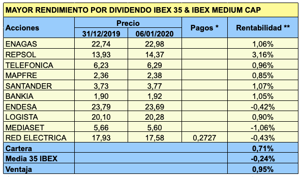 En 2019 la cartera que incluyó valores del Medium Cap fue más rentable que la que solo contuvo valores del IBEX 35: la primera ganó un 16,84% mientras que la segunda solo un 7,06%. Ver Resultado de las estrategias basadas en el rendimiento por dividendo en 2019