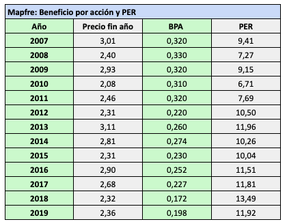 La aseguradora cerró a 2,36 € en 2019, lo que supone un ratio PER de 11,92. Actualmente (12 de febrero de 2020) cotiza a 2,42 €.