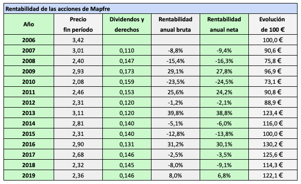 Cien euros invertidos en acciones de Mapfre en diciembre de 2006 valían 122,1 € al final de 2019 con la reinversión de los dividendos netos, algo más que si se hubieran invertido en el IBEX 35 con dividendos netos (111,5 €).
