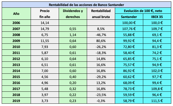 El cuadro siguiente indica la rentabilidad de las acciones del Santander de 2007 a 2019. Cien euros invertidos en las mismas en diciembre de 2006 se habrían convertido en 58,79€ con reinversión de los dividendos netos, la mitad que si hubieran sido invertidos en el IBEX 35.