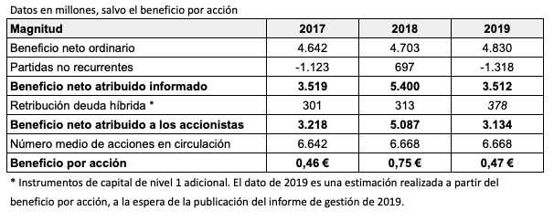En 2017 y 2018, el beneficio neto atribuido “a los accionistas“, según informaba el banco, incluía 301 y 313 millones de euros respectivamente de costes financieros contabilizados como beneficios. Para 2019 no tenemos aún el dato exacto debido a que la entidad no ha publicado aún su Informe de gestión anual. SIn embargo, podemos deducir la cantidad a partir del beneficio por acción, magnitud que sí descuenta dichos costes financieros. La cifra estimada es de 378 millones de euros. Así, el verdadero beneficio de los accionistas en 2019 fue de unos 3.134 millones de euros.