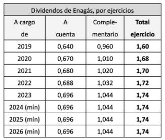 Para los ejercicios 2024-2026 espera pagar como mínimo 1,74 €, la misma cifra que en 2023. Se trata de un “dividendo suelo“, de modo que el importe podría ser superior.
