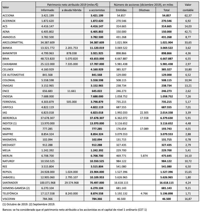 El valor contable es el cociente entre el patrimonio neto atribuido a los accionistas y el número de acciones, incluidas las dilutivas. Las acciones dilutivas todavía no se han creado pero serán emitidas a corto plazo en virtud de la existencia de bonos convertibles, planes de incentivos en acciones, etc. En el caso de los bancos, he considerado que el patrimonio neto a considerar es el capital de nivel 1 ordinario, que no incluye las emisiones de deuda híbrida tales como obligaciones perpetuas o deuda subordinada.