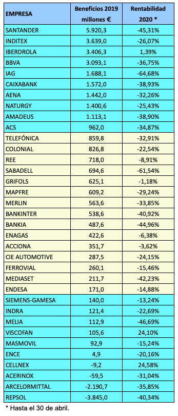 Las diez compañías del IBEX con mayor volumen de beneficios en 2019, salvo Iberdrola, perdieron más de un 25% en bolsa en el primer cuatrimestre del año. La pérdida media de este grupo, incluyendo dividendos, fue del 34,18%.