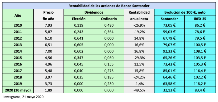 Si incluimos la evolución del Santander en 2020 hasta el 20 de mayo, la pérdida acumulada asciende al 68% incluso con reinversión de dividendos netos, mientras que la del IBEX 35 se queda en un 16,6%.
