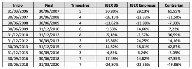 En el cuadro siguiente he resaltado en gris los períodos en los que la cartera Contrarian, que selecciona los cinco valores no financieros del IBEX 35 con el PER estándar más bajo, lo hizo mejor que las referencias del mercado, siendo la principal el IBEX Empresas. Las rentabilidades son acumuladas e incluyen dividendos. Se observa que la actual fase de desventaja dura ya siete trimestres, y es la más extensa desde que calculo esta cartera.