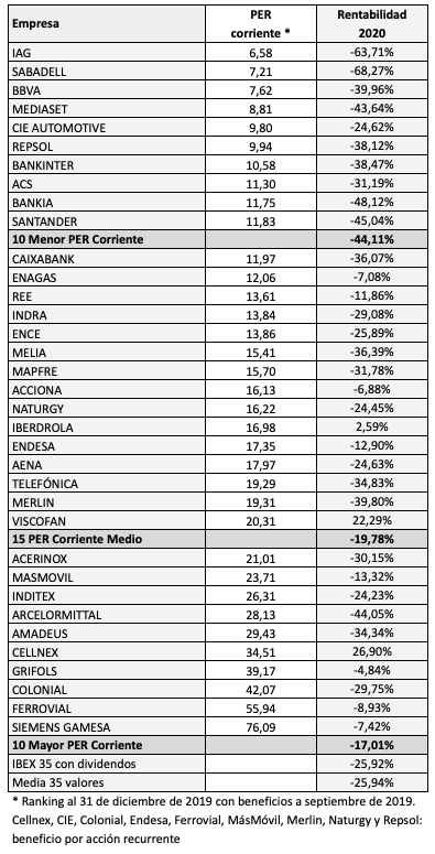 Los diez valores del IBEX 35 que en diciembre de 2019 tenían el ratio PER más bajo pierden un 44% en 2020, casi el doble que el 25,7% que se deja el índice, en ambos casos con dividendos incluídos.