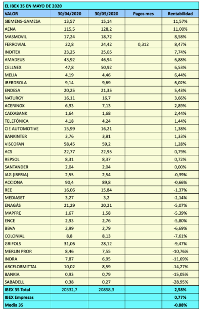 El IBEX 35 con dividendos se revalorizó un 2,58% en mayo. Sin embargo, la rentabilidad media de los 35 valores fue negativa en un 0,88%. Esto se debe a que algunos valores que más ponderan en el índice, como Inditex o Iberdrola, subieron más que la media, así como a la fuerte caída del Banco Sabadell, que se dejó un 29%. El 19 de mayo se volvieron a autorizar las ventas al descubierto, que habían sido prohibidas el 17 de marzo. Los especuladores se cebaron con el Sabadell y este cayó un 11,9%. El banco catalán y Bankia han sido las principales víctimas de los especuladores bajistas.