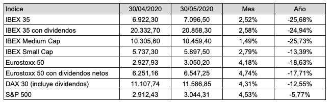 Al cierre de mayo, la bolsa española pierde un 25% en 2020, frente al 18% del Eurostoxx 50, el 12,5% del DAX y el 5,7% del S&P 500. Este resultado está en parte condicionado por el elevado peso de la banca en el IBEX. Si solo tenemos en cuenta las empresas no financieras, la pérdida media es del 20,8%, más en línea con el Eurostoxx 50. El IBEX Small Cap, que reúne 30 compañías de menor capitalización que las 35 del IBEX y las 20 del Medium Cap, retrocede menos que sus hermanos mayores, un 13,4%.