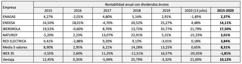 Las cinco compañías energéticas (eléctricas y gasistas) del IBEX 35 han generado una rentabilidad media con dividendos del 8,31% anual entre principios de 2015 y el 13 de julio 2020. En el mismo período, el IBEX 35 con dividendos ha perdido una media del 1,81% anual. Por tanto, este grupo de cotizadas lo ha hecho un 10,12% anual mejor que el índice.