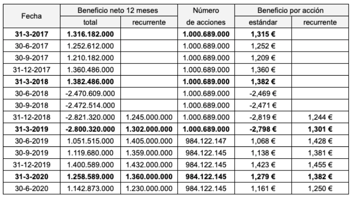 El beneficio neto de doce meses (junio de 2019 a junio de 2020) fue de 1.142,8 millones € (1.230 millones € en términos ordinarios). El beneficio por acción interanual es de 1,161 € (1,25 € ordinario). Esta magnitud continúa en declive: en 2009 fue de 1,34 € y en 2015 alcanzó los 1,501 €.