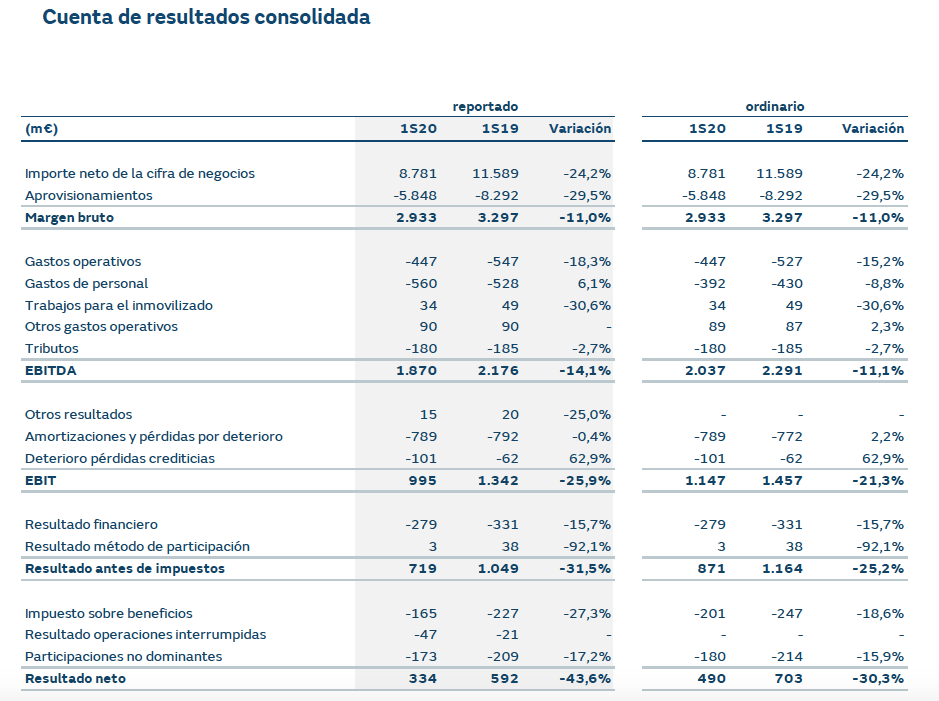 El beneficio neto de Naturgy fue de 334 millones € en el primer semestre de 2020, un 43,6% inferior al del mismo período del año pasado. En términos ordinarios, fue de 490 millones €, un descenso del 30,3%. El segundo trimestre fue considerablemente peor que el primero: el beneficio neto ordinario cayó un 41%, frente al 19% del primer trimestre.