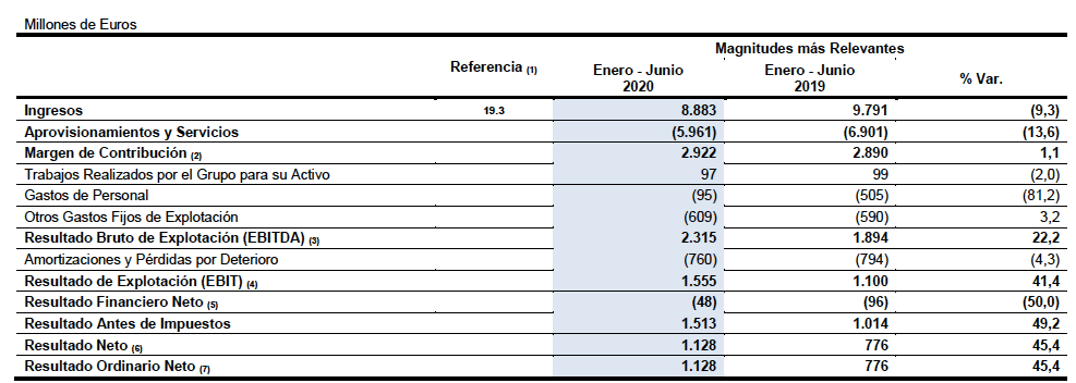 El beneficio neto de Endesa aumentó un 45% en el primer semestre de 2020 frente al mismo período de 2019, hasta los 1.128 millones €. SIn embargo, esta cantidad incluye una partida de 267 millones € por el efecto neto de una reversión de provisiones, debida a la aplicación del nuevo convenio colectivo, y de nuevas provisiones para futuras reestructuraciones de personal. Sin dicha partida, el beneficio neto habría sido de 861 millones €, un 11% más, a pesar de que la demanda de electricidad cayó un 7,4%.