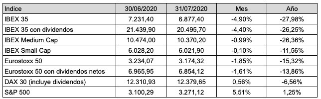 El IBEX 35 perdió un 4,90% en julio de 2020, un 4,40% con dividendos incluídos, a pesar de que el mes estuvo marcado por la esperada aprobación del fondo de recuperación europeo por valor de 750.000 millones de euros para el período 2021-2023. En virtud de este fondo, que será financiado con deuda conjunta de la Unión Europea, España contará con 72.700 millones de euros en ayudas directas y unos 67.000 millones de euros más en préstamos.