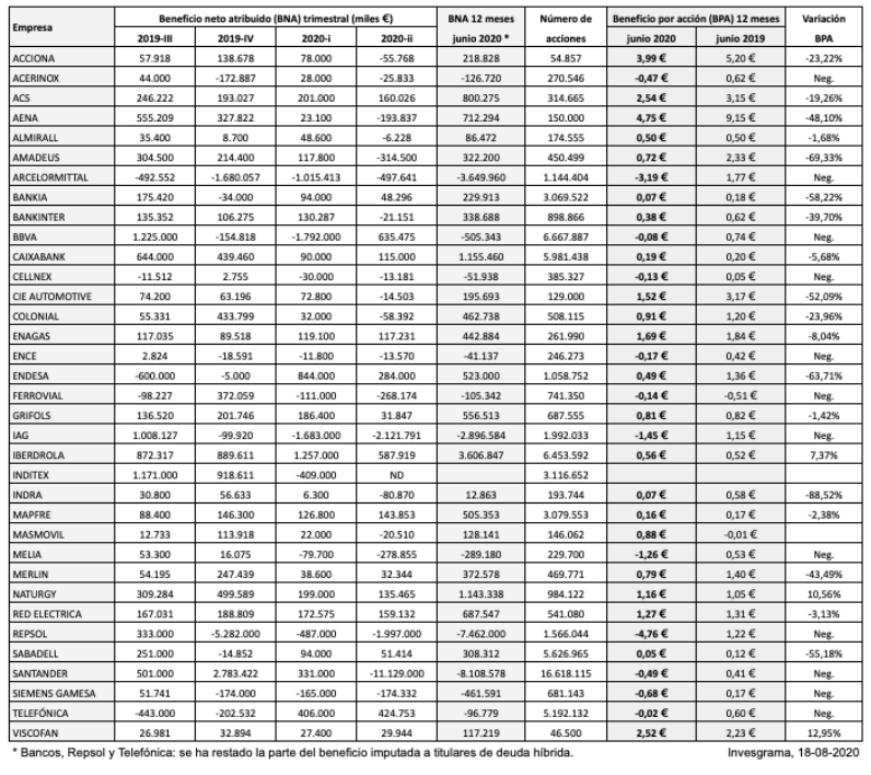 La tabla siguiente indica el beneficio neto atribuido a los accionistas por trimestres de las sociedades del IBEX 35. La magnitud acumulada de junio de 2019 a junio de 2020 excluye la parte del beneficio imputada a titulares de deuda híbrida, lo que se aplica a los bancos, a Repsol y a Telefónica. La última columna indica la variación del beneficio por acción interanual entre junio de 2019 y junio de 2020.