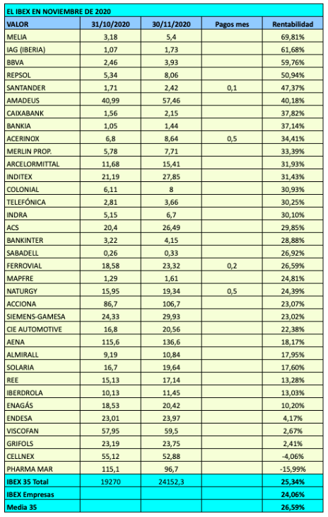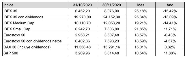 El IBEX 35 tuvo el mejor mes de su historia en noviembre, al revalorizarse un 25,34% con dividendos incluídos. El catalizador de la subida fue el anuncio, el día 9, por la estadounidense Pfizer y la alemana Biontech, de la primera vacuna contra la Covid-19 con posibilidades de recibir la aprobación de las autoridades en un breve período de tiempo y con una eficacia del 90% (que posteriormente fue ampliada al 95%). El día 16 la biotecnológica estadounidense Moderna presentó su antídoto contra el virus, con una eficacia del 94,5%. Unos días más tarde, el 23, la universidad de Oxford y la farmacéutica británica Astrazeneca anunciaron que su vacuna tenía una eficacia media del 70%.