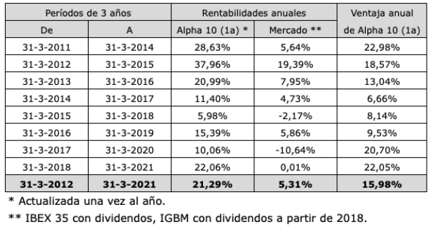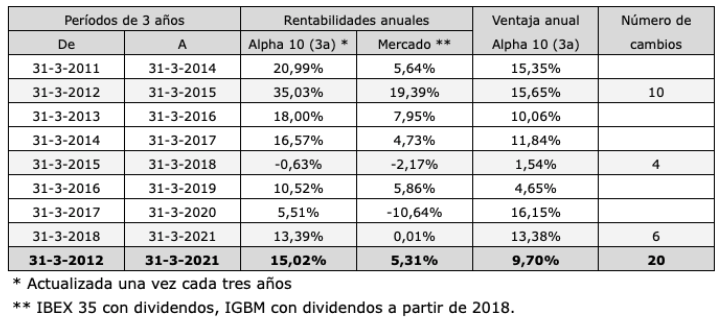 En la tabla siguiente se recoge la rentabilidad anualizada por períodos consecutivos de tres años. Vemos que en todos los períodos la Alpha 10 (actualizada una vez cada tres años) batió al mercado, aunque en el trienio de marzo de 2015 a marzo de 2018 lo hizo por un escaso margen.
