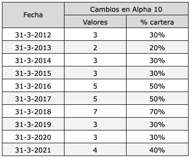 Supongamos que hubiéramos invertido en la Alpha 10 el 31 de marzo de 2012 y nos hubiéramos propuesto actualizarla únicamente una vez cada tres años, o sea en marzo de 2015 y en marzo de 2018. En marzo de 2012, al ser la primera vez que hubiéramos invertido, tendríamos que haber comprado los 10 valores. En marzo de 2015 hubiera sido necesario cambiar cuatro valores respecto a la cartera de 2012 y en marzo de 2018, seis valores respecto a la cartera de 2015.