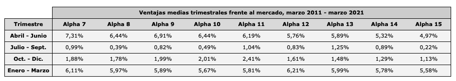 En cuanto a las ventajas por trimestres, vemos una pauta estacional más definida, pues los mejores trimestres en ese sentido fueron el de abril – junio y el de enero – marzo del año siguiente. Las carteras Alpha objeto de este estudio se constituyeron el 31 de marzo, por lo que es de destacar que la ventaja de las mismas sea similar, o incluso algo superior en algunos casos, en el trimestre de enero a marzo del año siguiente que en el trimestre inmediatamente posterior a la selección. Esto implica que son carteras que pueden adquirirse a lo largo del año, independientemente de la evolución de los valores que la componen. La razón subyacente es que se basan en gran medida en la solidez del balance, que tiende a experimentar pocos cambios a corto plazo.