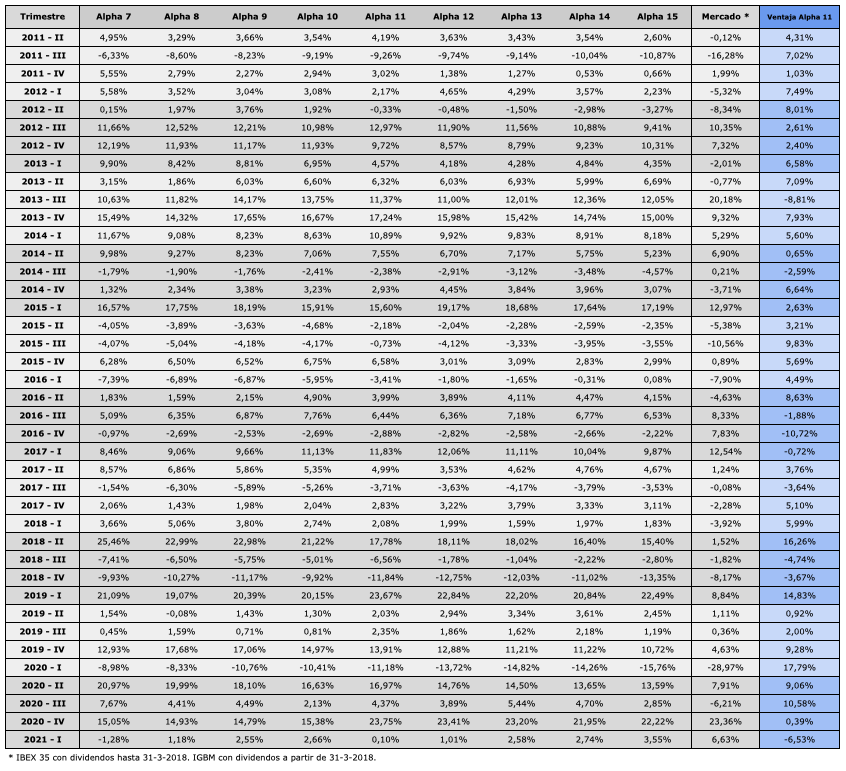 La tabla siguiente recoge la rentabilidad por trimestres de las Alpha de 7 a 15 valores desde marzo de 2011 a marzo de 2021. También se indica la rentabilidad con dividendos del mercado y la ventaja trimestral de una de las carteras, la Alpha 11, respecto al mercado. (En próximas revisiones los datos pueden sufrir algunas ligeras variaciones al alza porque es posible que queden por contabilizar algunos derechos de suscripción de algunos valores de fuera del IBEX).