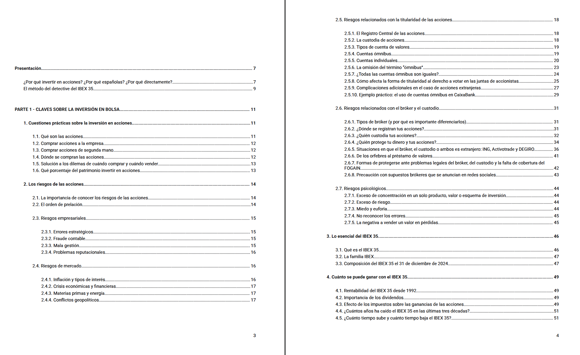 Además de ofrecer el marco general de la inversión en acciones, abordando cuestiones prácticas, los peligros que acechan al inversor y la evolución histórica del IBEX 35, el Detective también investiga áreas que pueden afectar de modo significativo a la seguridad del inversor, como la custodia de valores, las diferencias entre tipos de brókeres, los riesgos de las cuentas ómnibus, qué implica que el bróker use uno o varios subcustodios, así como las limitaciones de los fondos de garantía, es decir, el Fondo de Garantía de Depósitos (FGD) y el Fondo de Garantía de Inversiones (FOGAIN).