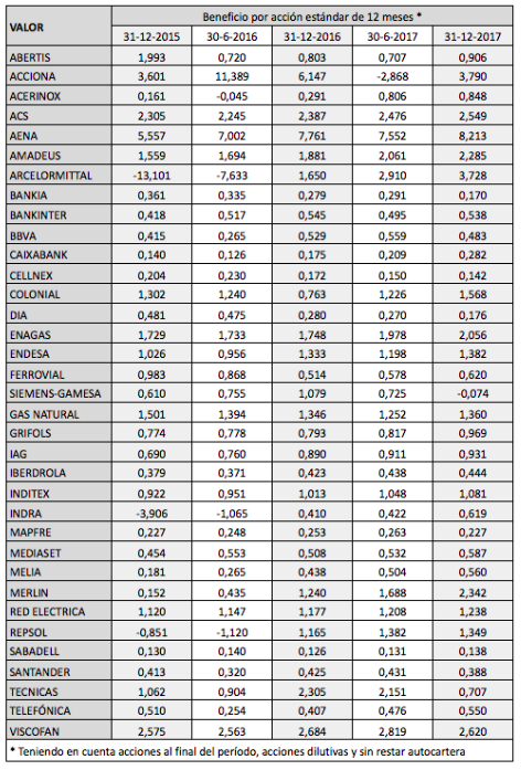 Los datos al 31 de diciembre se refieren al año natural salvo en el caso de Inditex, cuyo año fiscal acaba en enero. Los datos al 30 de junio se refieren al beneficio por acción acumulado en los doce meses anteriores, salvo para Inditex, cuyo primer semestre acaba en julio.