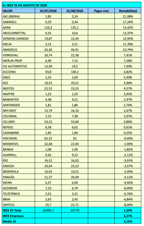 En 2020 tres valores abandonaron el IBEX 35, Mediaset, MásMóvil y ENCE. El 22 de junio Mediaset fue sustituida por Almirall. El 21 de septiembre la papelera ENCE fue remplazada por Pharma Mar. MásMóvil fue excluida el 14 de septiembre debido a la OPA de KKR, Cinven y Providence, y Solaria ocupó su lugar el 19 de octubre.
