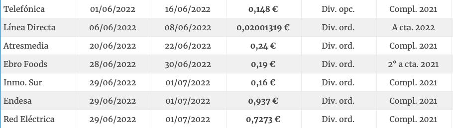 La siguiente información ha sido elaborada el 8 de febrero de 2022. Para una información actualizada, así como para el cuadro con los pagos mensuales previstos, ver la página Dividendos IBEX 35 previstos en 2022.