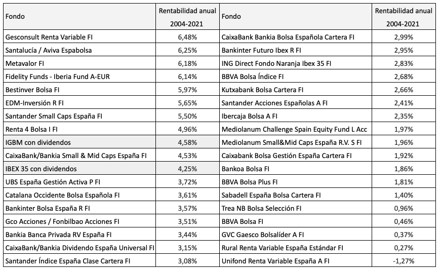 Como se ve en la tabla siguiente, el fondo de distribución de Lyxor hubiera dado una rentabilidad media del 6,82% anual suponiendo la reinversión de los dividendos brutos (hasta 2014 fue posible no tributar por los primeros 1.500 € de dividendos), mientras que con el fondo acumulativo de Xtrackers la rentabilidad fue del 7,33% anual, 0,51 puntos anuales más. Si se consideraran los dividendos netos, por ejemplo con una retención fiscal del 19%, la rentabilidad del Lyxor habría sido del 6,13% anual, una diferencia de 1,20 puntos anuales respecto al fondo acumulativo de Xtrackers.