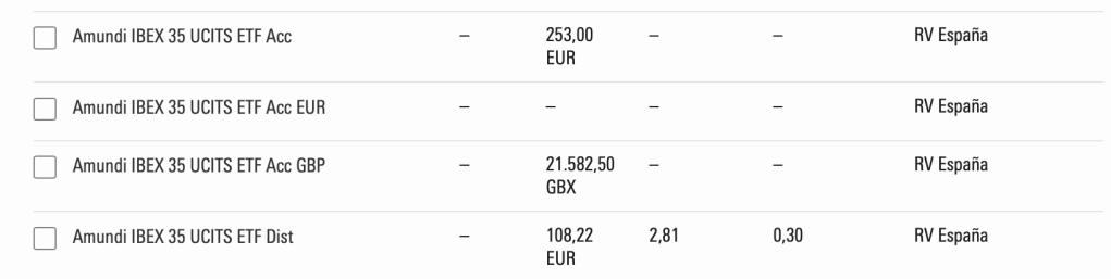 En la página de Morningstar, el nuevo ETF ya aparece en el listado (con un precio de 253 €) y el hasta ahora Amundi IBEX 35 UCITS ETF ha pasado a denominarse Amundi IBEX 35 UCITS ETF Dist (con un precio de 108,22 €).