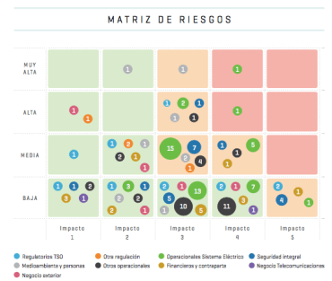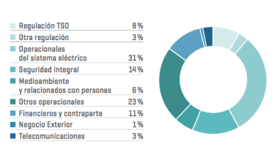 Hay que destacar que desde la perspectiva de Red Eléctrica, los riesgos principales no coinciden exactamente con los que percibe el mercado, que son los tres primeros enumerados con anterioridad, sino los cuatro siguientes. El cuadro de la izquierda indica la distribución de riesgos según la categoría.