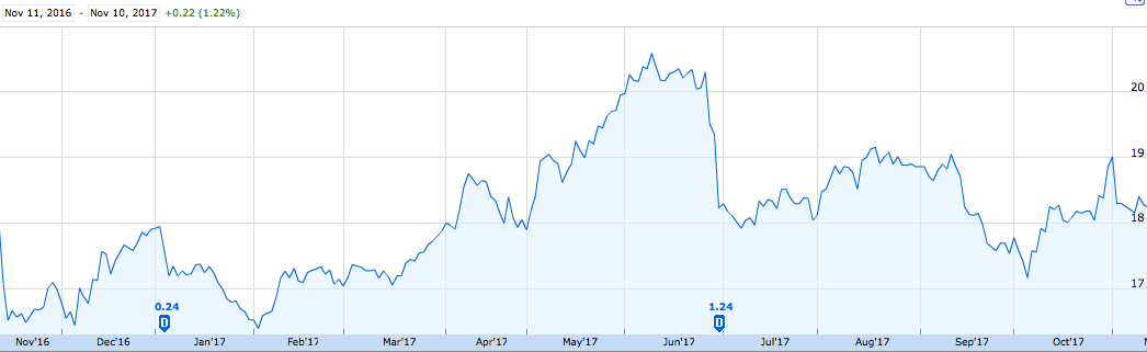El beneficio por acción de 12 meses de septiembre de 2016 a septiembre de 2017 es de 1,22 €, de modo que al precio actual de 18,25 €, el ratio PER es de 14,90 veces, un valor correcto para la compañía.