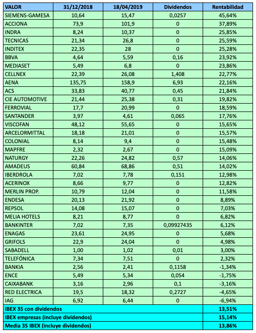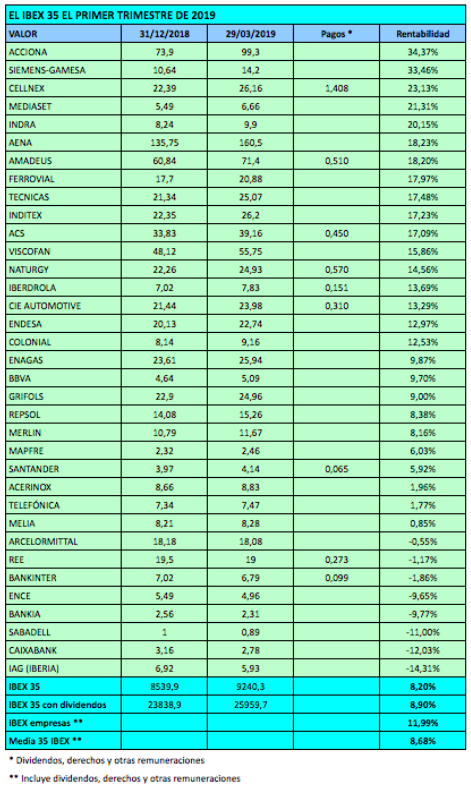 El IBEX 35 se revalorizó un 8,20% sin dividendos y un 8,90% con dividendos en el primer trimestre de 2019. La rentabilidad media de las empresas no financieras fue más alta, del 11,99%, debido al peor comportamiento de los bancos que, a excepción de BBVA y Santander, acabaron en negativo. Los bancos se vieron perjudicados por la decisión del Banco Central Europeo (BCE), el 7 de marzo, de aplazar las subidas de tipos de interés al menos hasta el verano.