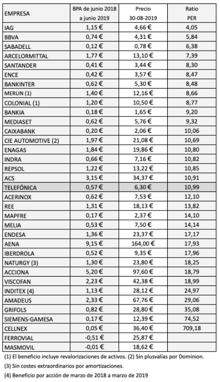 El cuadro siguiente indica los datos necesarios para el cálculo del ratio PER del IBEX 35. En tanto que el IBEX 35 es un índice ajustado por capital flotante (capital que no está en manos de accionistas de control), se ha tenido en cuenta la capitalización y los beneficios corregidos por los coeficientes de ajuste que utiliza la Sociedad de Bolsas. Cuanta mayor es la proporción del capital de una empresa en poder de accionistas significativos, menor es el coeficiente de ajuste, de modo que más se reduce la ponderación efectiva de dicha empresa en el índice.