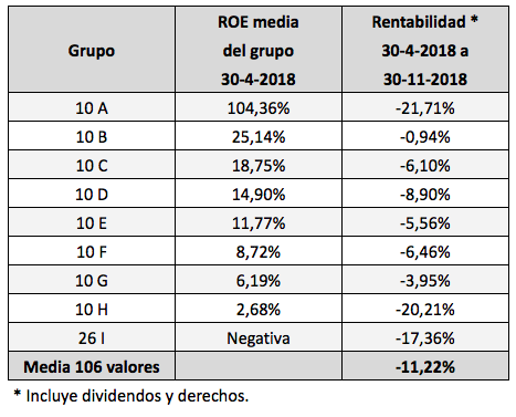 26 de las 106 empresas del mercado continuo consideradas tuvieron una ROE negativa en el ejercicio 2017. Su rentabilidad bursátil de mayo a noviembre fue negativa en un 17,36%.