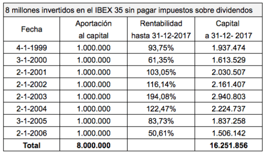 Si Bárcenas hubiera invertido ese millón de euros al principio de cada uno de esos años en acciones representativas del IBEX 35, al final de 2007 su capital hubiera sido 16,2 millones de euros, bajo el supuesto (realista en este caso) de que no hubiese pagado impuestos sobre los dividendos. Pero su capital fue tres veces superior.