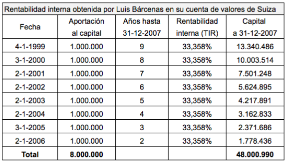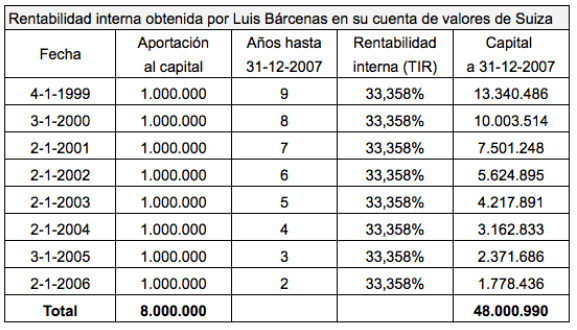 Si ahora hacemos un cálculo similar pero de modo que el capital al 31 de diciembre de 2007 sea de 48 millones, la TIR resultante es del 33,358% anual. Esta sería la rentabilidad efectiva obtenida por Luis Bárcenas en la gestión de su cartera de valores de su cuenta suiza. En definitiva, estaríamos en presencia de un inversor que dejaría en pañales a leyendas como Warren Buffett o Peter Lynch.