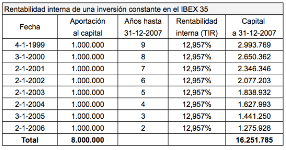 Calculemos ahora cuál habría sido la rentabilidad interna de un inversor que hubiera hecho aportaciones constantes en el IBEX 35 en las fechas indicadas. A tal fin, la suma de las aportaciones capitalizadas a una tasa de rentabilidad determinada tiene que dar el capital final obtenido, en este caso 16,2 millones de euros. Esa tasa de rentabilidad es la TIR.