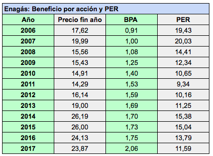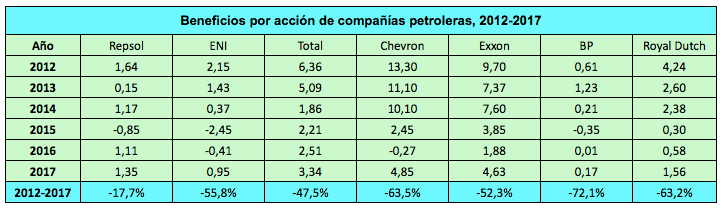 Todas las petroleras mencionadas han reducido su nivel de beneficios de forma significativa desde 2012 debido a la fuerte caída del precio del petróleo. Repsol es la que lo ha hecho mejor relativamente en este sentido, pues la caída de su beneficio por acción ha sido de un 18% entre 2012 y 2017 mientras que la del resto de compañías ha sido de la mitad o más (ver cuadro siguiente).