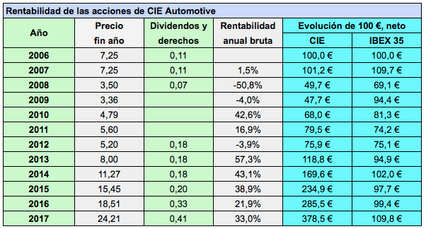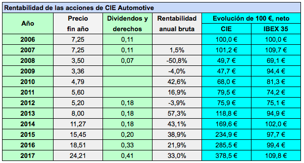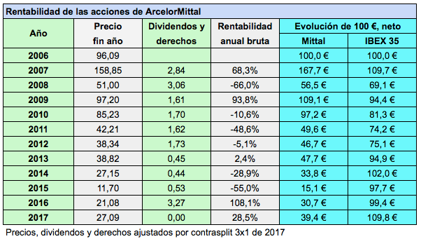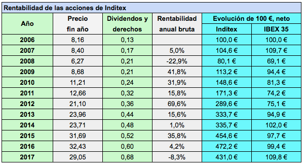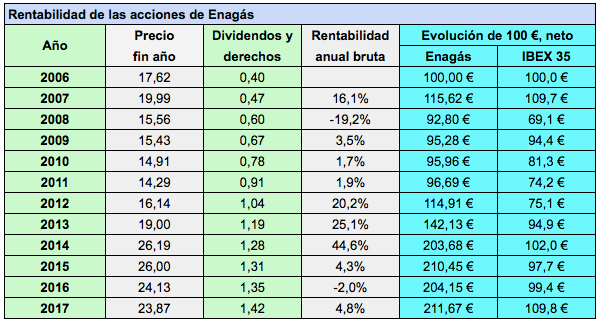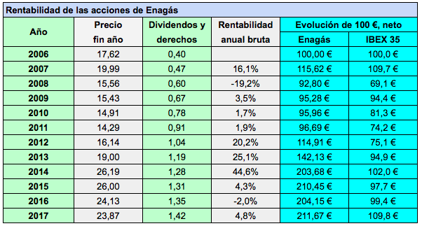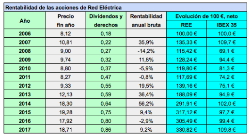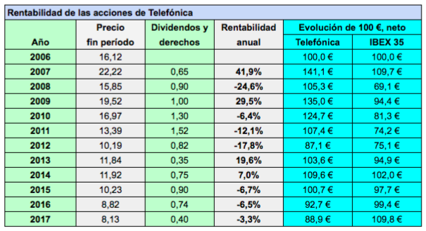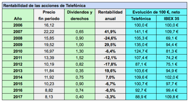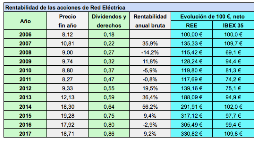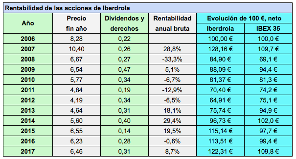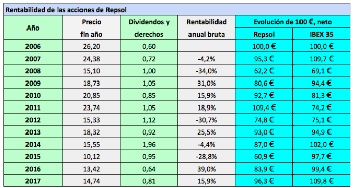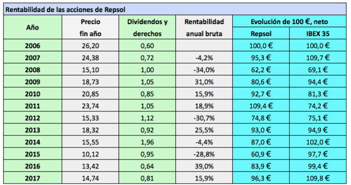 La acción de Repsol ha sido un 12% menos rentable que el IBEX 35 con dividendos desde 2006. Cien euros invertidos en títulos de la petrolera en diciembre de 2006 se habrían convertido en 96,3 € después de impuestos sobre dividendos mientras que en el IBEX 35 habrían crecido a 109,8 €.